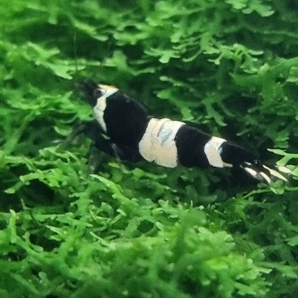 Black Panda Shrimp are a striking Bee shrimp variety, recognized for their bold black and white bodies, sometimes with a subtle hint of blue. They thrive in well-maintained aquariums with stable water parameters, making them an impressive addition for experienced shrimp keepers.